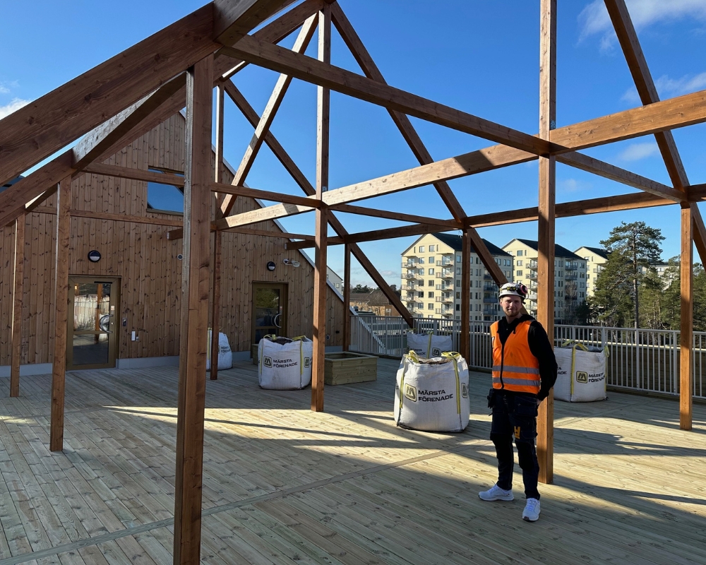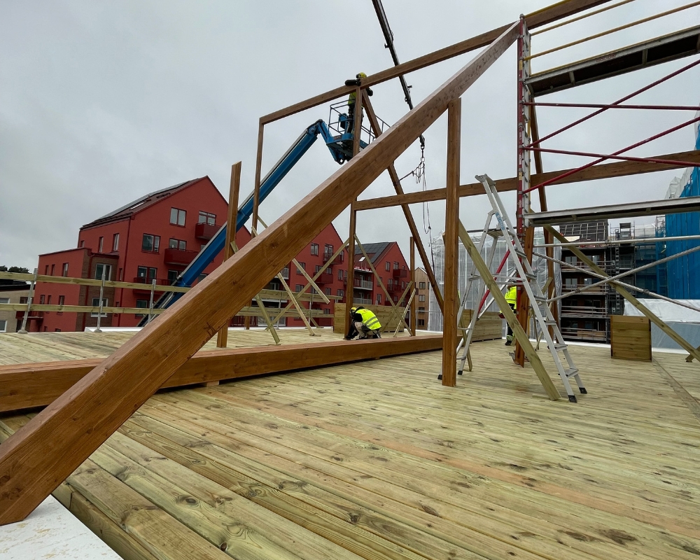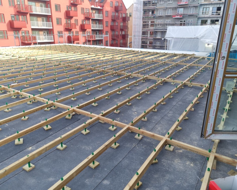 I Stockholmsförorten Jordbro pågår ett projekt som kombinerar nybyggda lägenheter med en förskola. På taket skapas just nu ett mysigt uterum för förskolans personal – med golv från Nivell.